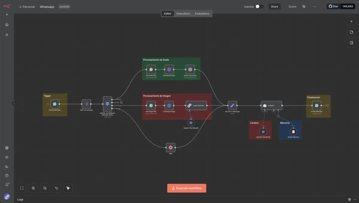 • Flujos prácticos con WhatsApp, Notion, Telegram, Slack, OpenAI y más